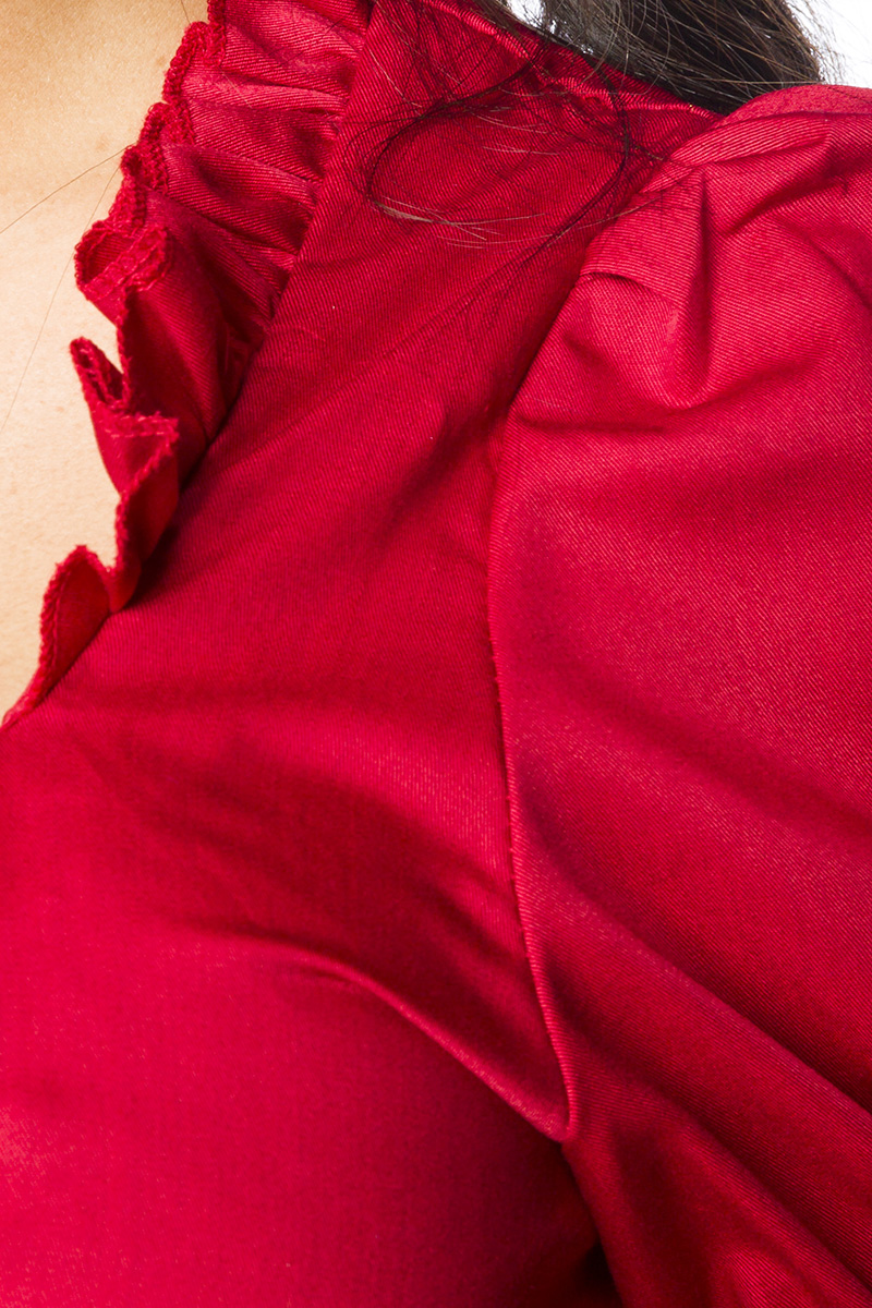 Stilechte Dirndl-Bluse mit Halbarm in rot. Kann vorne mit einem Band zusammengezogen werden.... mehr