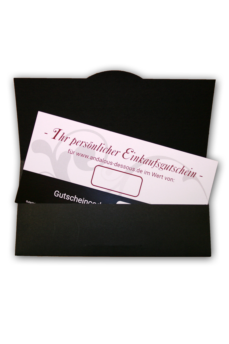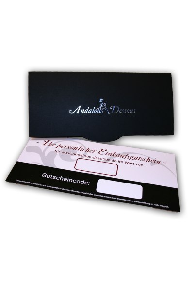 Geschenkgutschein über 75 Euro. Ein Gutschein für Andalous Dessous ist das perfekte Geschenk für Weihnachten, Geburtstage oder andere Anlässe. Der Gutschein gilt für alle Bestellungen auf www.andalous-dessous.de und ist unbegrenzt gültig. Wir schicken den Gutschein per Post als schön gestaltete Gutscheinkarte in einem edlen Umschlag mit silberner Prägung.