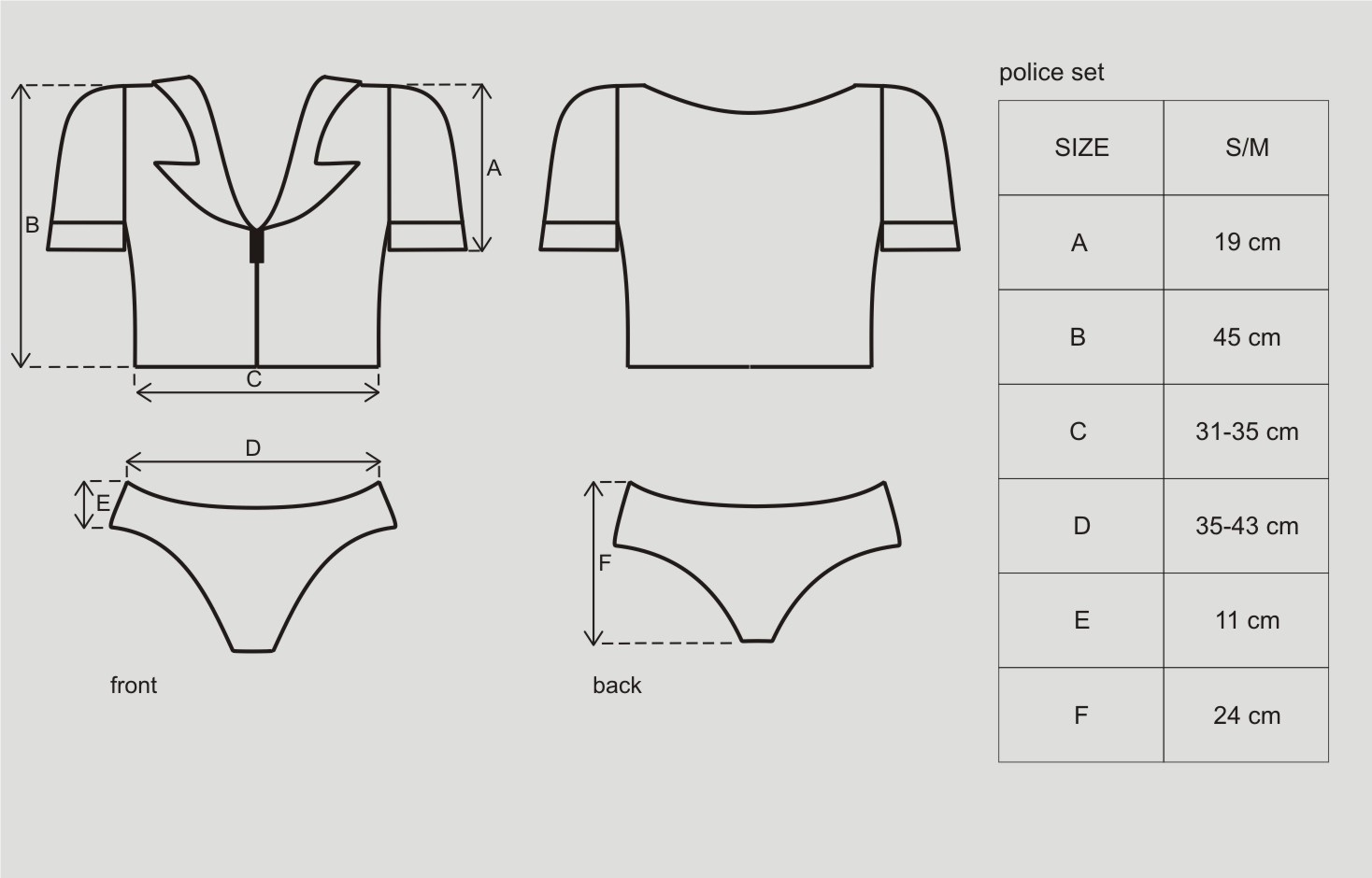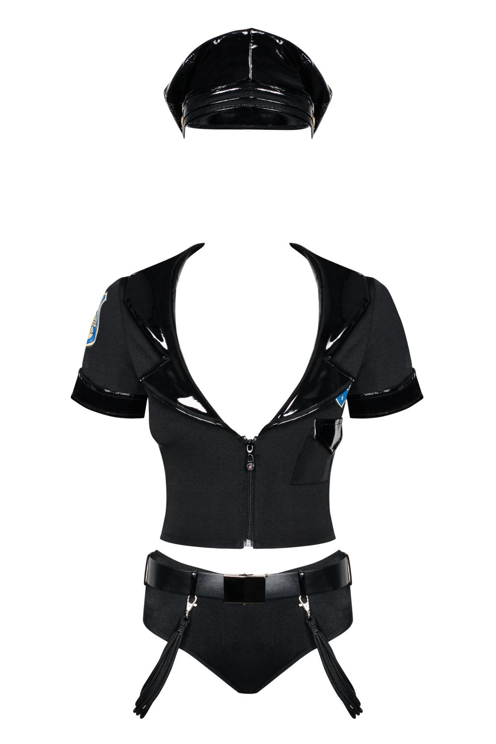 Sexy Polizei-Kostüm "Police" bestehend aus: Shorts, Oberteil mit Reißverschluss und Dienstplaketten am rechten Arm und über der linken Brust, Polizei-Mütze aus Lack-Material, zwei abnehmbare Bündel die am Gürtel befestigt sind. Farbe: schwarz Größe: S/M Material: 80% Nylon, 20% Elasthan Lieferumfang: Oberteil, Panty, Gürtel, Mütze