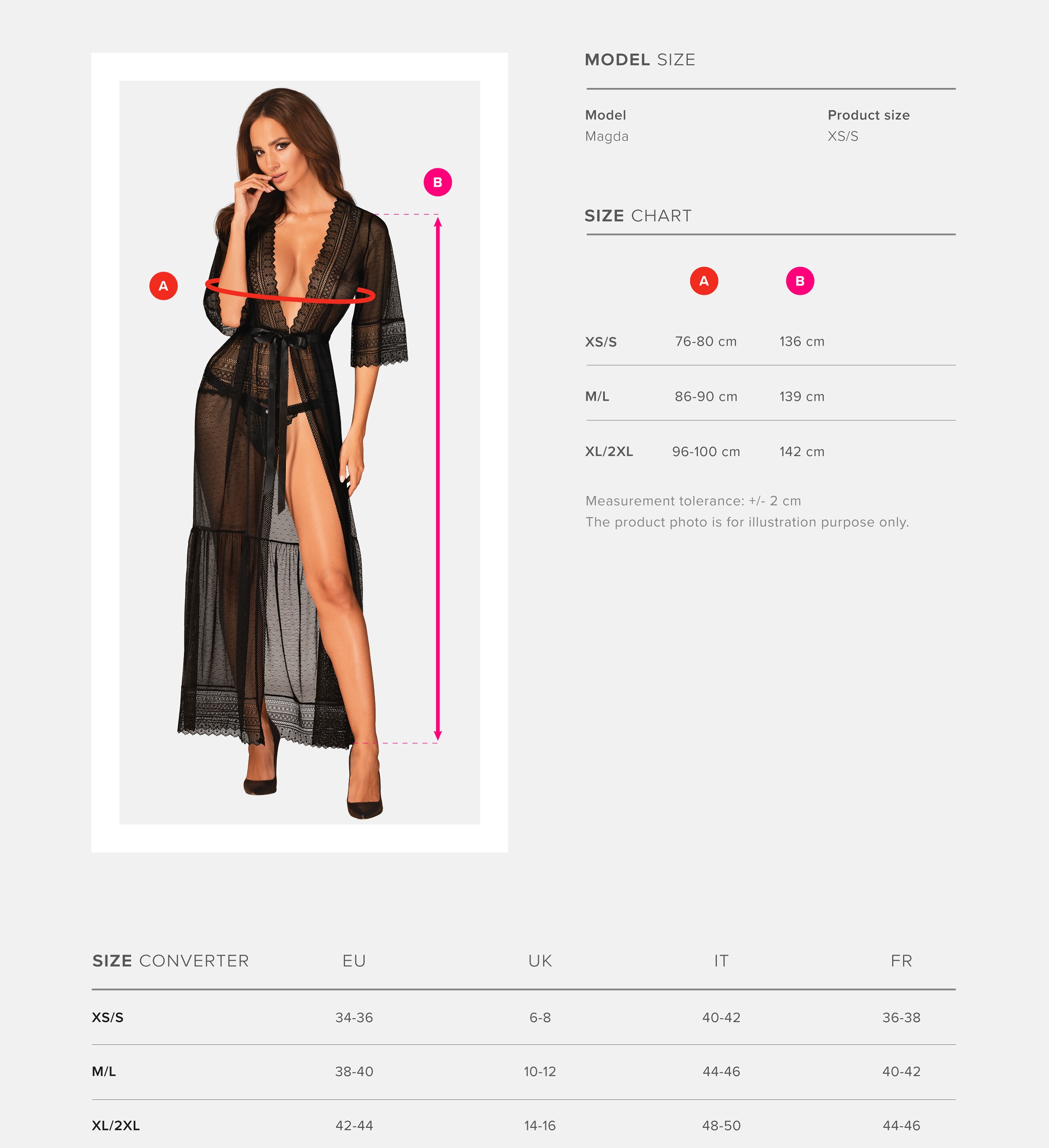Langgeschnittener Morgenmantel aus schwarzem, transparentem Tüll mit kurzen Ärmeln. Aufwendig gemustert und mit Spitze verziert. Ohne String.